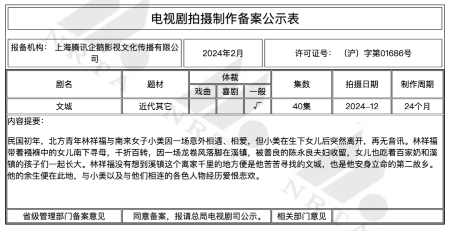 腾讯视频备案近代传奇情感剧《文城》,该剧改编自余华同名小说,背景设置在清末民初的动荡年代,讲述了一个人百转千回的寻找和一个年代人们的爱恨悲欢。北方青年林祥福与南来女子小美相爱后离散,林祥福带着襁褓中的女儿南下寻母,因一场龙卷风落脚在溪镇,却未曾想到这个离家千里的地方便是他苦苦寻找的、妻子小美所在的“文城”。