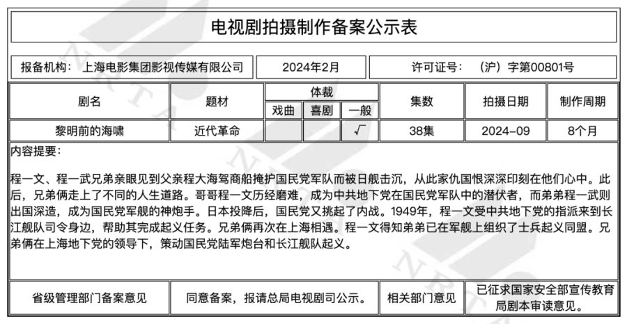 另一部备受瞩目的年代剧《黎明前的海啸》由上海电影集团备案。该剧根据郭金炎同名纪实文学改编,通过程一文、程一武兄弟的经历,真实地披露了汪伪海军和国民党海军起义内幕。