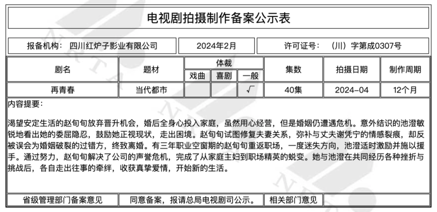 由稻草熊影业百分百控股的四川红炉子影业备案都市情感剧《再青春》。该剧改编自辛夷坞小说《浮世浮城》,网传将由秦岚出演,并将于近日开机。