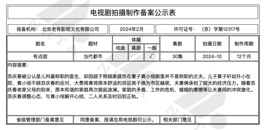 此外,老有影视备案当代都市剧《有点甜》。该剧改编自徐婠连载于起点中文网的小说《生活挺甜》,故事紧贴时代,职业叙事甚佳,被评为优质的现实派网文。