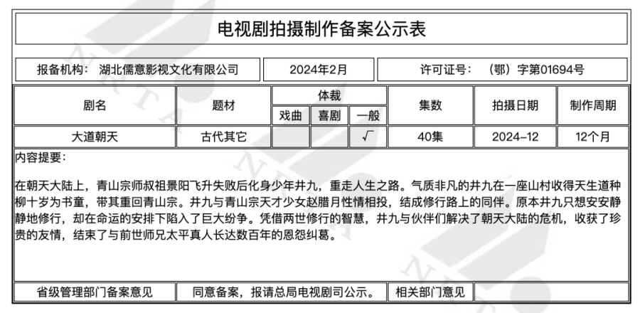 男频大剧《大道朝天》由湖北儒意影视递交备案,该公司由上海儒意影视百分百控股,也就是大众所熟知的儒意影业。该剧改编自超人气网文大神猫腻的同名小说,原文连载于起点中文网。值得注意的是,影视综漫IP联动的现象已经愈发普遍。由哔哩哔哩出品,中影年年制作的动画版《大道朝天》早在2022年下旬官宣制作,并有望在2024年播出。