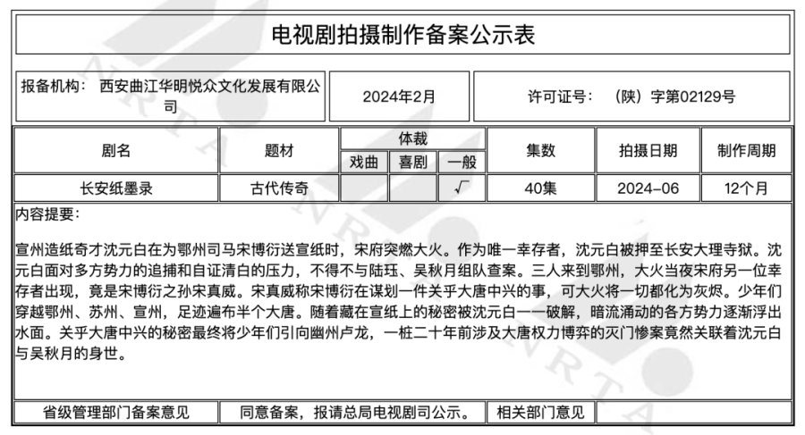 古装题材热度不减:《长安纸墨录》备案,新力量、哇唧唧哇布局