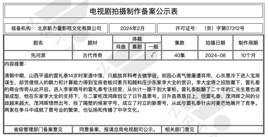 新力量影视备案古代传奇剧《先河源》。该剧的原型故事取材于中国票号创始人山西平遥人雷履泰的传奇事迹。