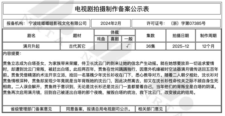 此外,哇唧唧哇影视备案古装仙侠言情剧《满月升起》。