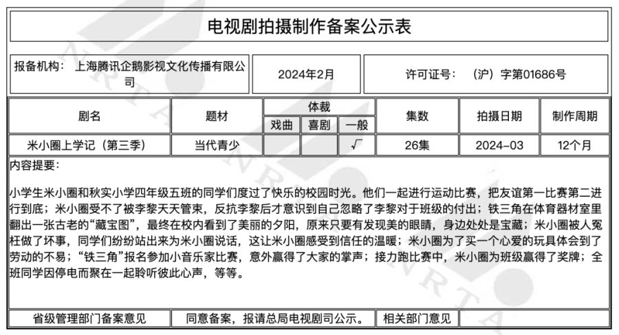 腾讯视频头部儿童剧IP《米小圈上学记》第三季已成功备案,第二季近期在腾讯视频、央视八套刚刚收关,在家长和孩子群体中收获较好口碑,第三季继续由工夫小戏制作,想必该IP除了原著之外,真人剧也养成了不少的观众基础。