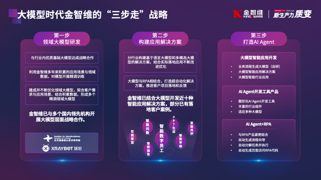 在务实主义的驱动下,金智维较早便对大模型应用需求做出预判,为了让更多企业切实把握住这一波智能化机遇,更高效、低门槛地接入大模型能力,金智维提前在技术范式和架构方面做了布局,形成了大模型“三步走”战略,以推动RPA与大模型的融合。
