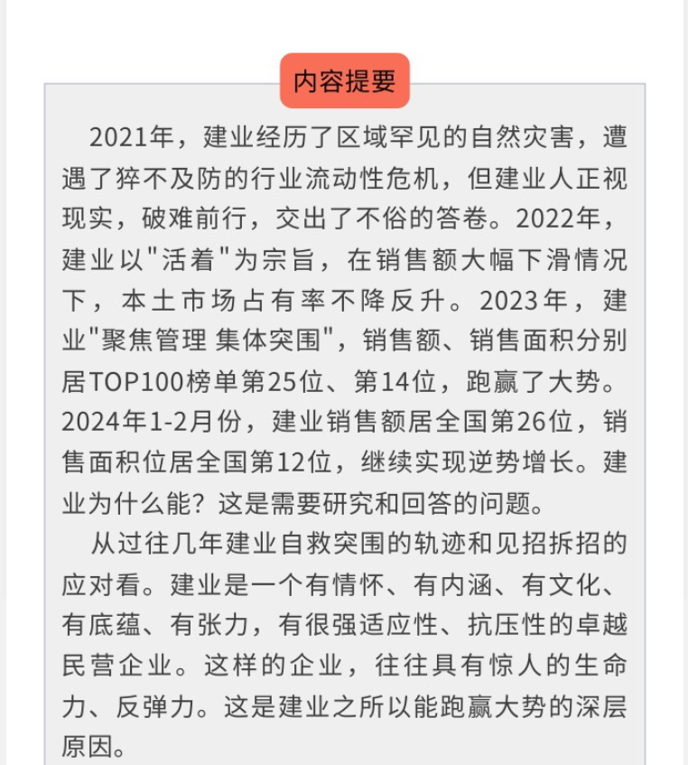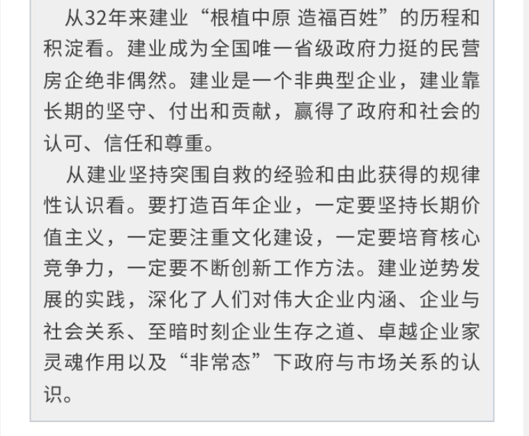 其三,深化了对至暗时刻企业生存之道的认识。在我国房地产业深陷泥潭的日子里,建业创造了"两个奇迹":一是没有畏惧,没有躺平,而是顽强坚守,破难前行,实现了逆势发展,本土市场占有率不降反升;二是建业是全国唯一得到省级党委政府公开力挺的民营房企,省委书记、省长亲自过问、协调帮扶建业事宜。这两个奇迹背后,是建业多年形成的极具特色的生存之道在起作用。如坚持长期价值主义,守信用、负责任,走正道、务正业、肯吃亏,顺天时、借地利、求人和,追求卓越、坚忍图成等。天不变,道亦不变。建立在赢取民心服务民众基础上的"生存之道",是建业赢得社会信任、赢得政府支持、赢得生存空间的无价之宝。