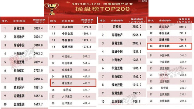 2023年,建业以448.9亿元的销售金额、675.6万㎡的销售面积,分别居全国销售额榜单第25位、销售面积榜单第14位。在河南本土房企中,建业集团2023年销售额高于第2-11名的总和,销售面积超过第2-15名的总和。