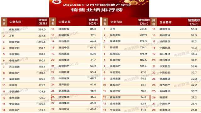 2024年1-2月,建业集团销售额46.6亿元,位居全国第26位,销售面积销售面积74.8万㎡,位居全国第12位。超过本土房企第2-10名的销售额总和,超过本土房企第2-19位销售面积总和。请看以下"排行榜":