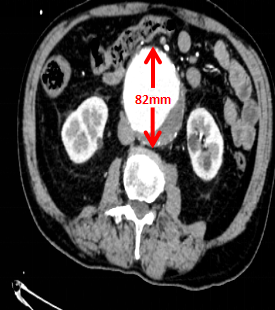 CTA显示:腹主动脉明显直径已达82mm(正常直径11-25mm)
