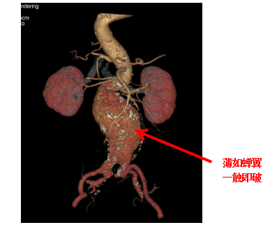 患者到院 CTA显示:患者腹主动脉巨大动脉瘤,直径>80mm,随时有破裂的风险,一旦腹主动脉瘤破裂,患者随时会出现失血性休克,甚至死亡。