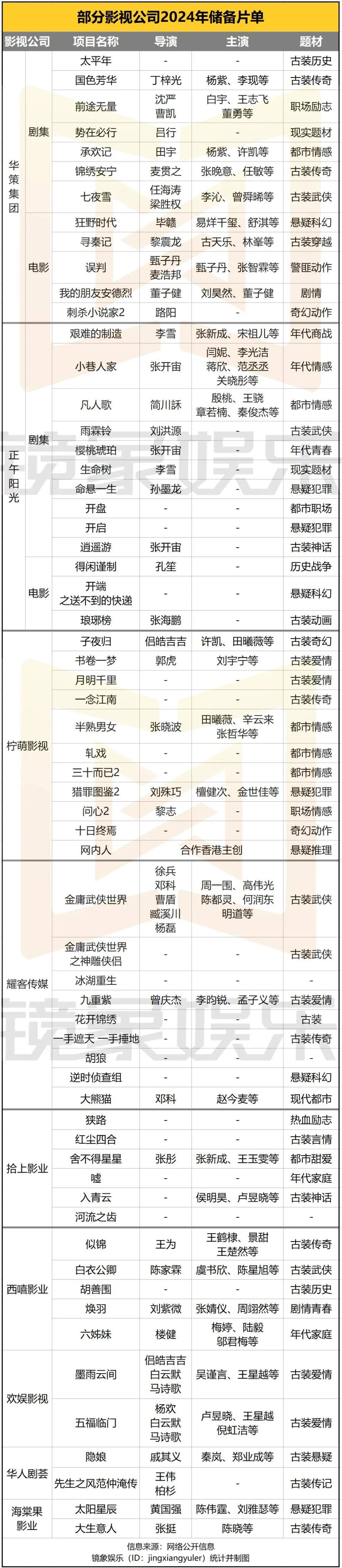 相比之下,片单中几乎一半都是古装剧的耀客传媒,则把重心放在武侠剧上。整体上说,近两年,市场围绕武侠剧的布局有回暖迹象,2023年,无论是新武侠类的《莲花楼》、还是偏喜剧的《鹊刀门传奇》都拿到不俗的成绩,行业对武侠剧的投入也在增长。
