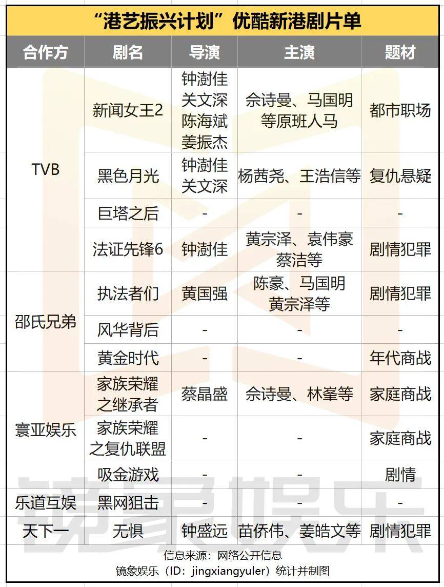 另一方面,腾讯视频也着重强调了平台的港剧内容,除了与TVB合作《巾帼枭雄之悬崖》《企业强人》《反黑英雄》《刑侦12》四部定制剧外,还将与海棠果影业合作警匪片《太阳星辰》,后者由陈伟霆、刘雅瑟等主演。平台参与下,港剧市场或将更快回温。
