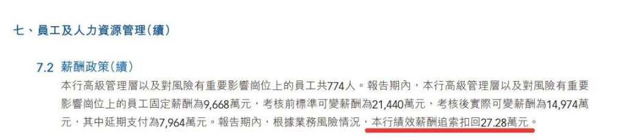 同在港股上市的天津银行,也首度在财报中披露其绩效薪酬追索扣回具体金额。