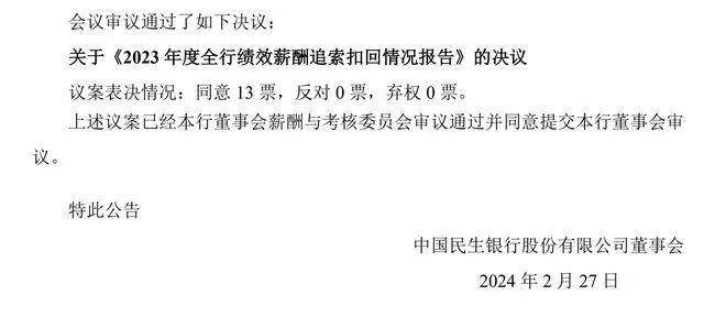 银行等金融机构向员工“反向讨薪”并不鲜见。在2月底,民生银行发布公告称,公司董事会审议通过了《2023年度全行绩效薪酬追索扣回情况报告》(下称《报告》)。这也是今年上市银行首份公开提到的薪酬追索扣回报告。