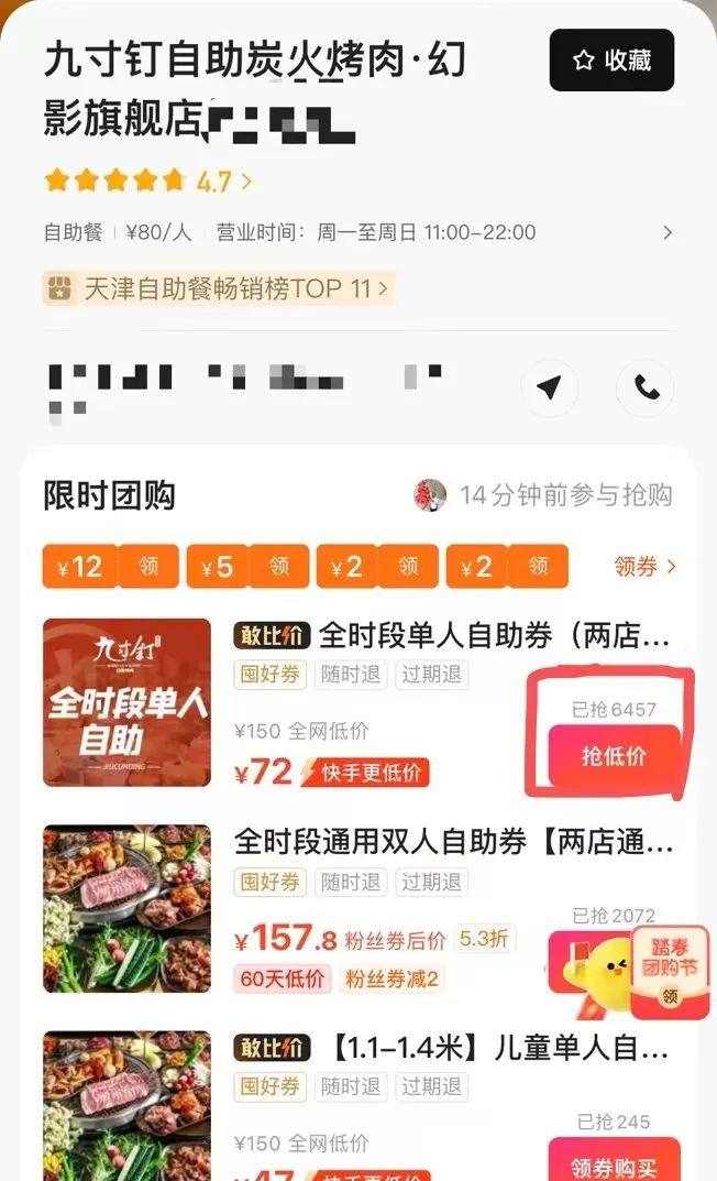 尽管快手有全网低价,但销量表现并不算好。这款单人自助烤肉券,在美团半年的销量是1.9万+,在抖音页面的销量达到了2万+,而在快手的销量是6457。这样来看,这款团购在快手的销量仅是美团、抖音的零头。