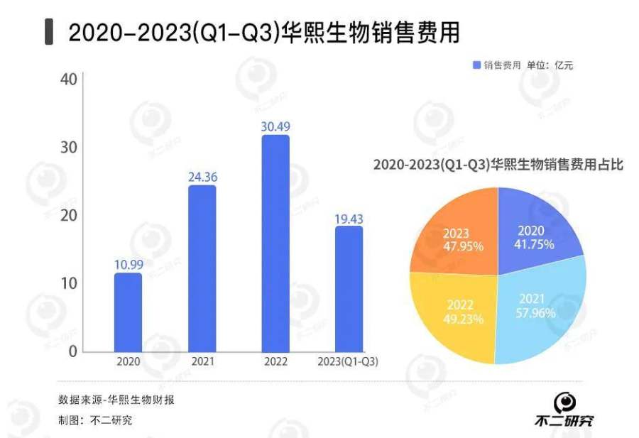 据华熙生物财报显示,其2020-2023年前三季度销售费用分别为10.99亿元、24.36亿元、30.49亿元、19.43亿元;分别同比增长110.84%、121.66%、25.16%、-36.27%;营收占比分别为41.75%、57.96%、49.23%、47.95%。