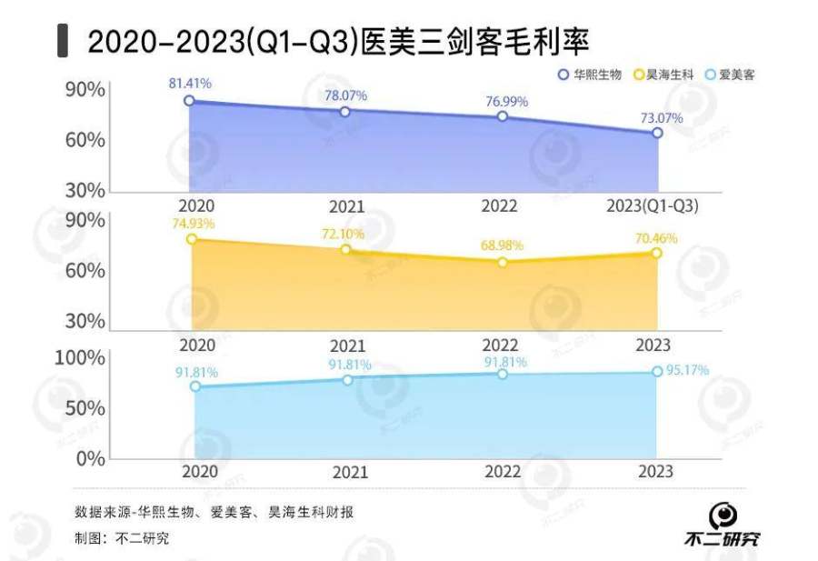2023年,医美三剑客业绩出现分化:昊海生科、爱美客营收净利均实现同比增长;而华熙生物营收净利双降。在「不二研究」看来,华熙生物的净利润出现下滑主要是由于其功能性护肤品营收的减少以及毛利率的下降所导致的;与此同时,随着玻尿酸市场的竞争愈发激烈,产品同质化问题加剧以及价格战的持续,为其带来了更多的不确定性。