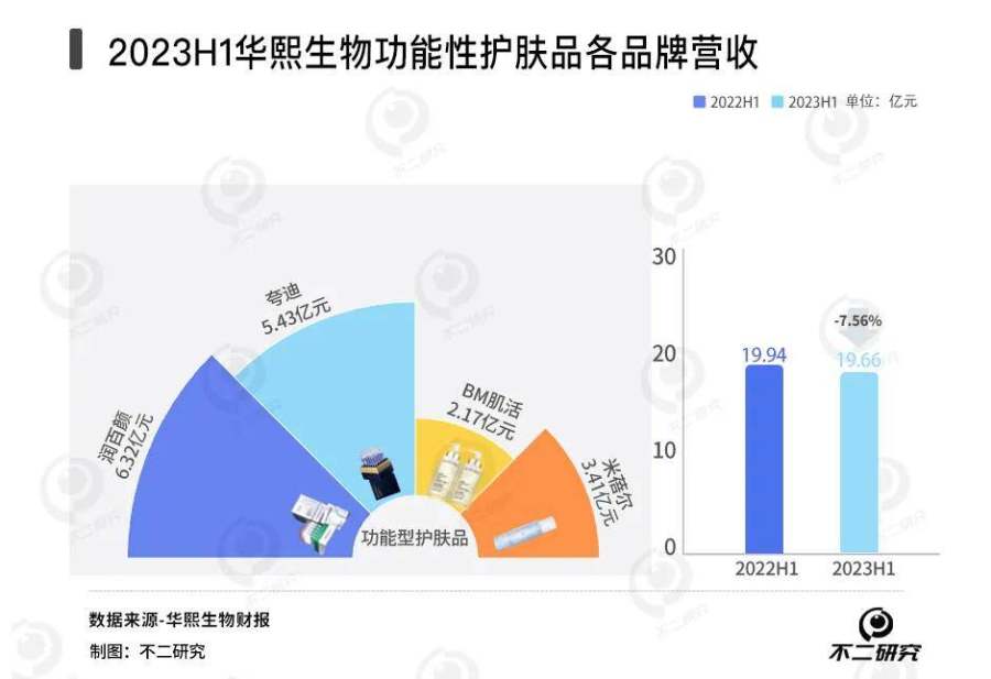 目前,功能性护肤品已成为其主要收入来源。据华熙生物2023年半年报显示,功能性护肤品实现收入19.66亿元,同比减少7.56%,占营收比例为63.92%。四大品牌中,润百颜、夸迪、米蓓尔、肌活的营收分别为6.32亿元、5.43亿元、2.17亿元、3.41亿元。