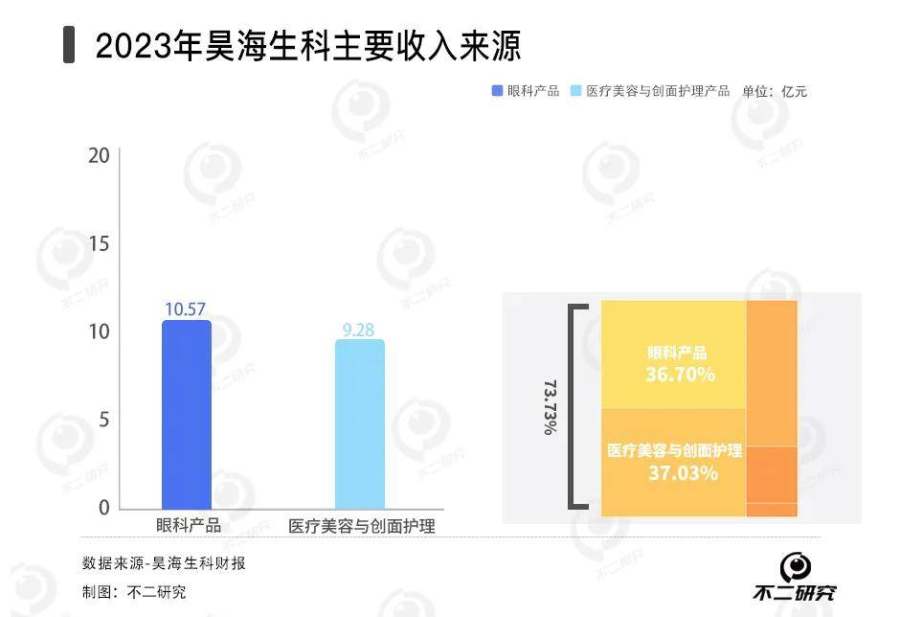 据昊海生科2023年报显示,眼科和医美创新产品业务是公司最大业务,2023年其眼科产品和医疗美容与创面护理产品分别实现收入10.57亿元、9.28亿元,分别同比增长41.27%、20.57%,占营收比例分别为39.82%、34.97%。