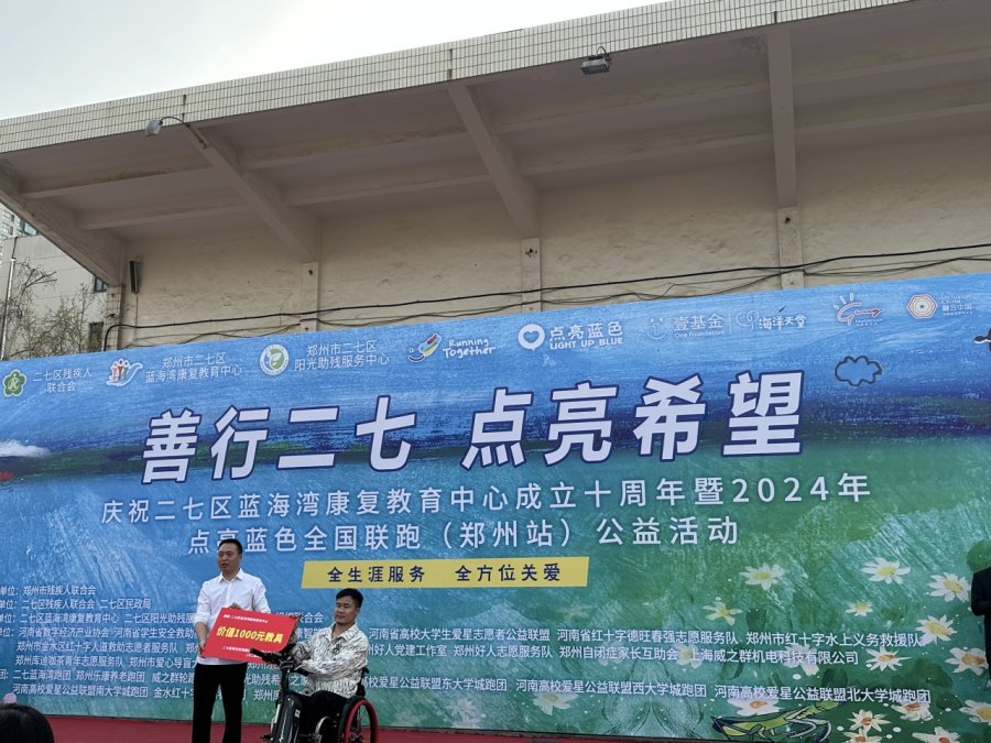 上海威之群机电科技有限公司、郑州好人志愿服务队等爱心单位与二七区阳光助残服务中心希望之家残疾人陈刚共同为二七区蓝海湾康复教育中心捐赠了价值6000余元的教具,为现场10名孤独症儿童送上了关心和慰问。