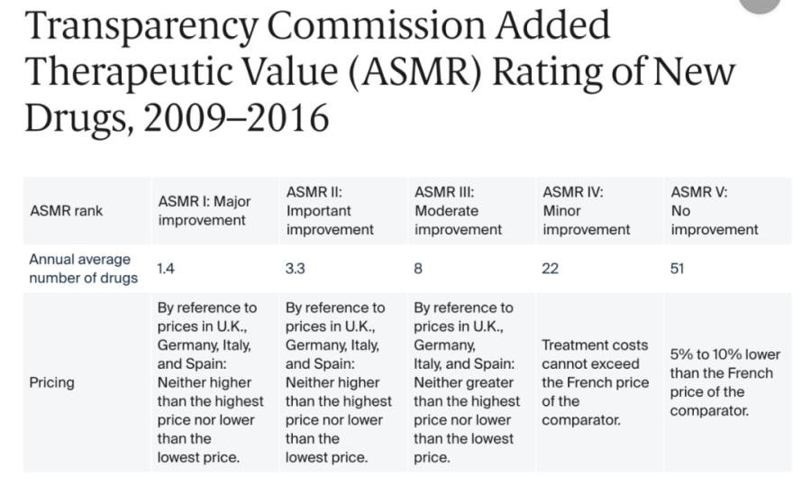 法国明确创新奖励制度,通过创新委员会将药物按照创新价值进行等级划分,共分为5个等级。对临床改进效益分类(ASMR)中的1-4级药物,其价格可按欧盟主要4个国家的最高价格制定。对没有任何创新的5级药物,定价会低于法国市场上的同类药物。