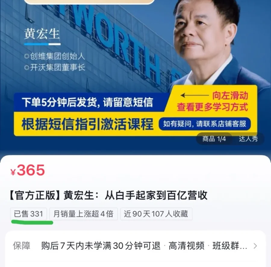 三言今日发现,创维集团创始人、创维汽车董事长黄宏生在短视频平台上架了商业课程,售价365元。目前销量331。