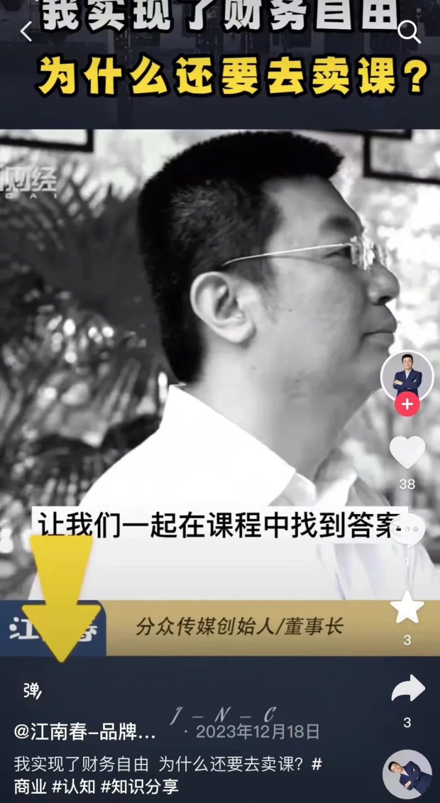 江南春的一个账号(疑似代运营)在一个标题为“我实现了财务自由 为什么还要去卖课?”的视频中称,他觉得他的奋斗能够为中国新经济品牌的引爆,为推动给中国品牌化的浪潮尽一份力,让他们的企业能做的更好,创造更大的利润。