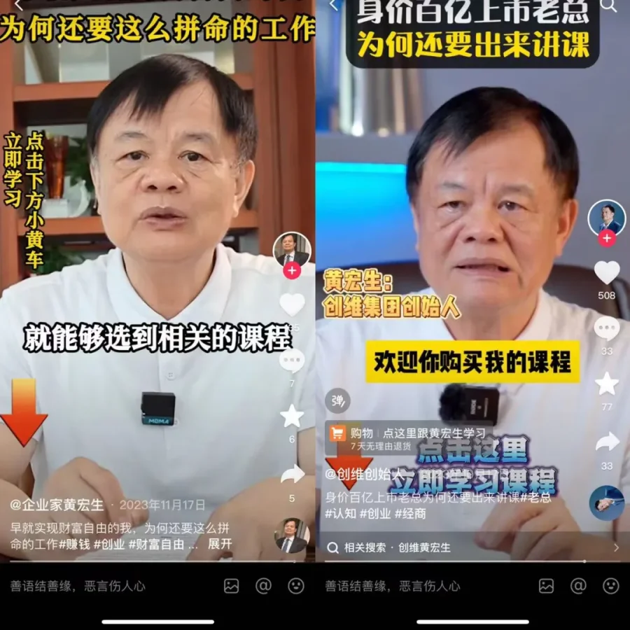 视频的结尾,黄宏生引导观众购买其课程,称其为了帮助千千万万的创业者突围,他把他的经验和教训放在了线上课程。