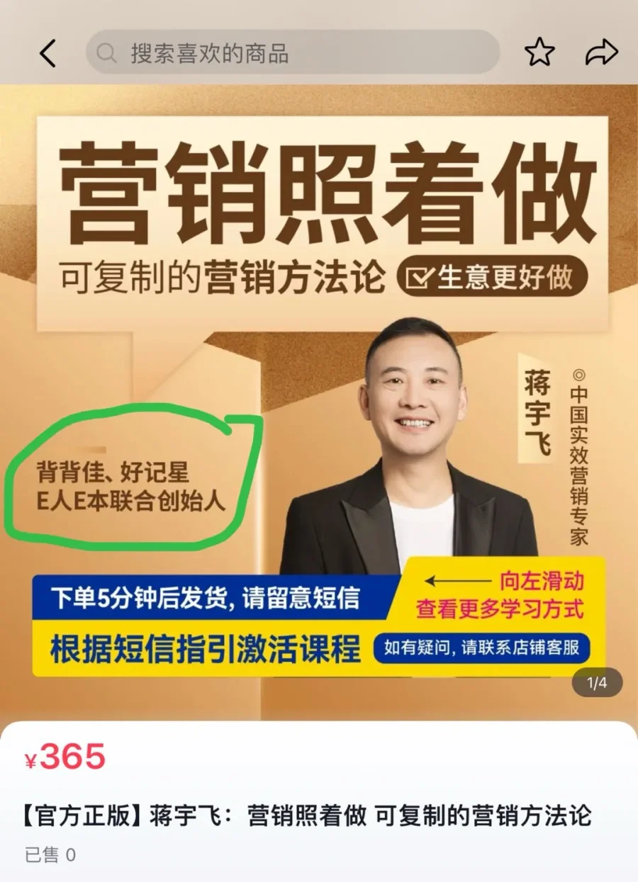 背背佳、好记星、E人E本联合创始人蒋宇飞也在售卖365元的课程。销量目前显示为0。其背后操盘公司同样是博商。