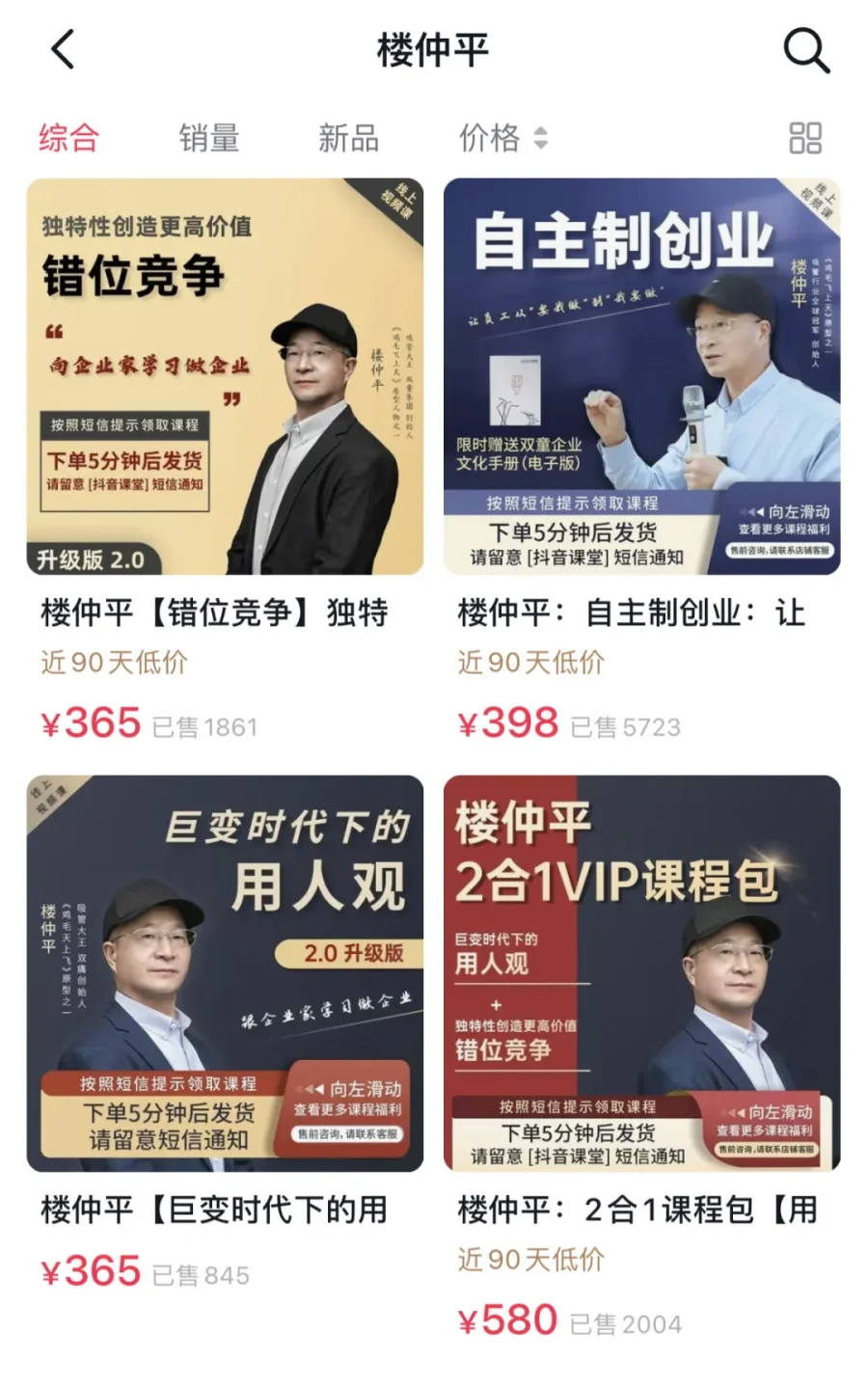 义乌市双童日用品有限公司董事长楼仲平也在短视频平台售卖几款课程。其中两款售价365元,一款售价398元,一款售价580元。销量方面,从数百到数千不等。