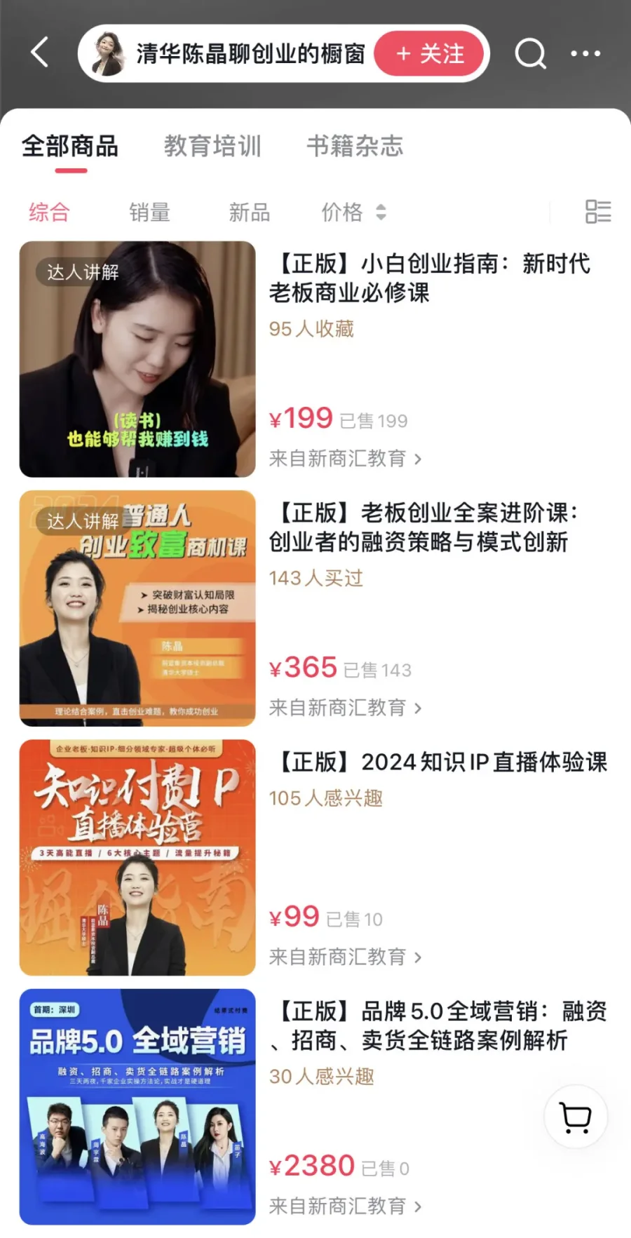 有售价199元的《小白创业指南》,销量显示为199;有售价365元的《老板创业全案进阶课》,销量显示为143;有售价99元的《2024知识IP直播体验课》,销量显示为10;还有售价2380元的《品牌5.0全域营销》,销量显示为0。