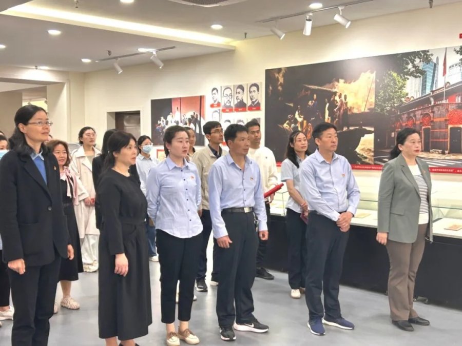 在党史馆内,面对鲜红的党旗,淮河路小学党支部书记郑晓艳和卢氏一小支部书记段勤学的共同带领党员教师面对党旗,庄严宣誓,重温入党誓词,表达为党奋斗终身的决心。