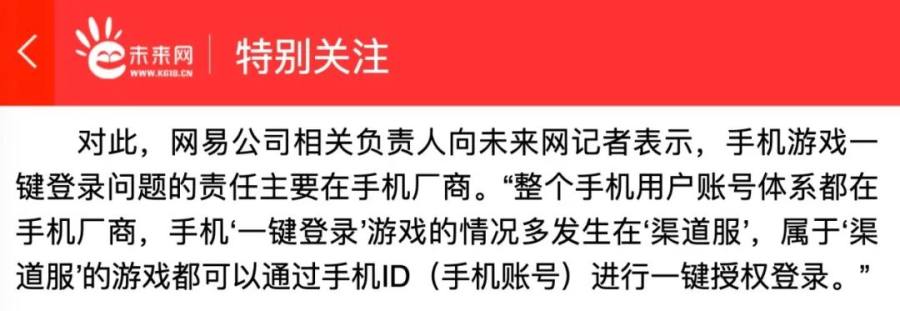 渠道服的实名漏洞成为了严厉的防沉迷规定的裂痕,尤其涉及游戏公司和手机厂商双方,实操界限、责任归属变得模糊起来。早在去年,网易就已经意识到了问题所在,向未来网记者表示,手机游戏一键登录问题的责任主要在手机厂商。“整个手机用户账号体系都在手机厂商”。