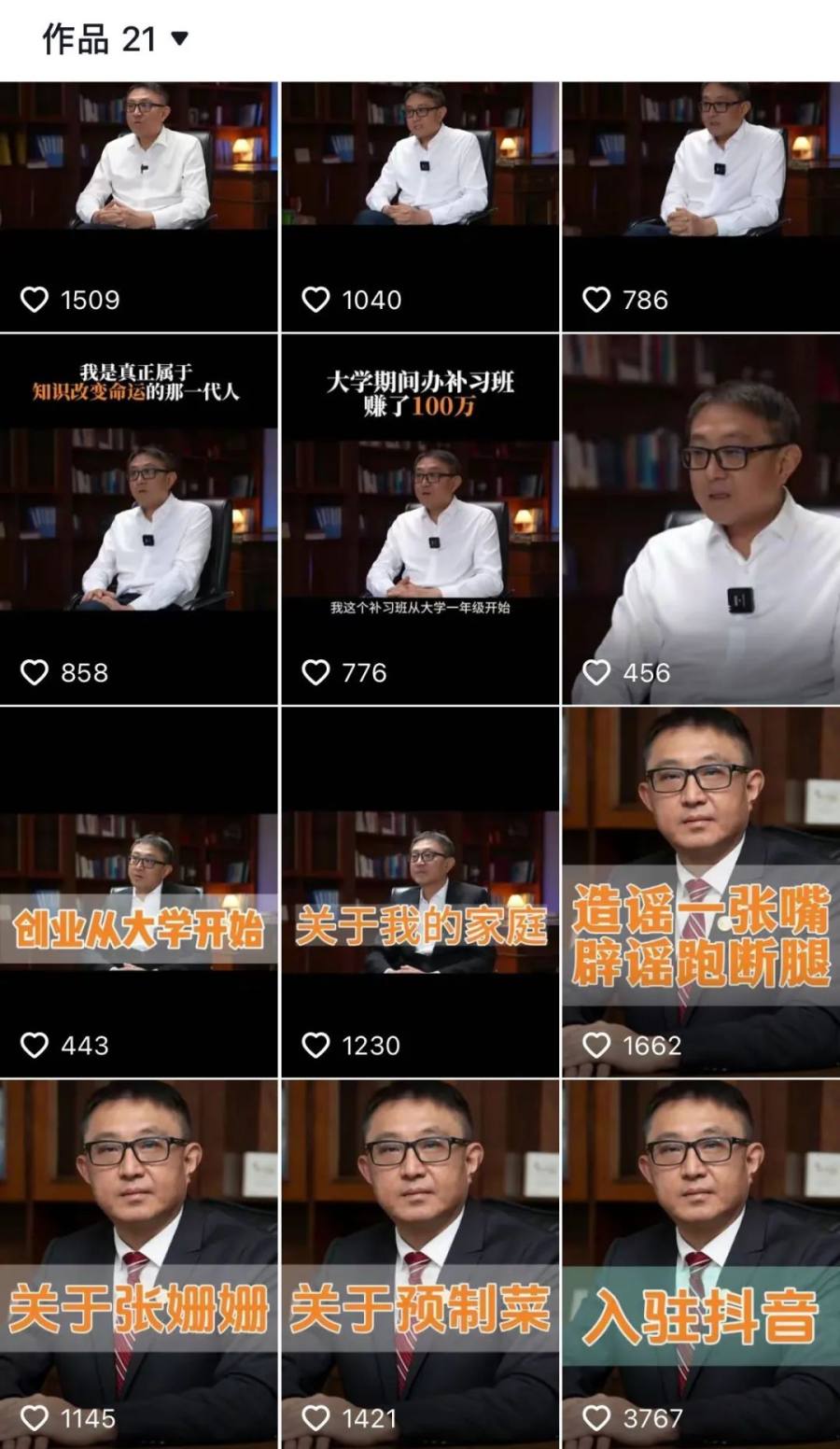 在少数的几条和辟谣无关的视频里,他分享了家乡的美食、高中母校、公司团建,还有回乡祭祖,还有他向家乡学校捐钱的视频。