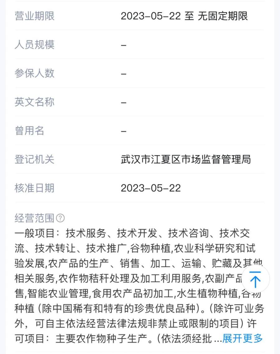 天眼查资料显示,武汉核子农业科技有限公司成立于2023年5月22日,核子基因成员,注册资本500万,法定代表人为廖磊。该公司由深圳市核子基因科技有限公司百分百控股,实际控制人为张核子。