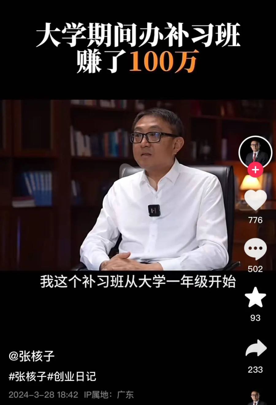 张核子称自己的创业是从大学时候的勤工俭学开始的,因为家里条件不好,生活费很拮据,只能想办法挣钱。