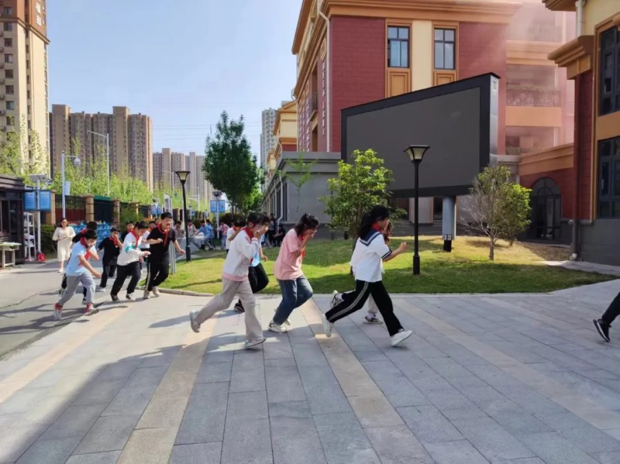 15时15分,警报突然响起,随后“浓烟”四起,广播中传出“请全体师生迅速撤离到操场”。各班级反应及时,班主任和任课老师迅速有序组织疏散,学生弯着腰用手帕、毛巾等捂住口鼻,手扶墙壁沿按指定楼梯口快速离开教学楼,有序撤退集结至操场安全区。