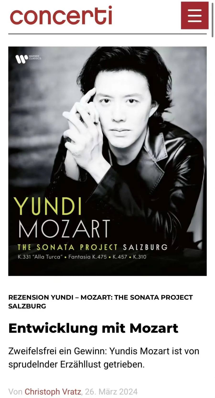 弗莱堡的首站演出结束后,权威德国古典音乐杂志《CONCERTI》在乐评中盛赞“云迪演绎了顶级的莫扎特”,而乐迷们同样给出了高度评价。