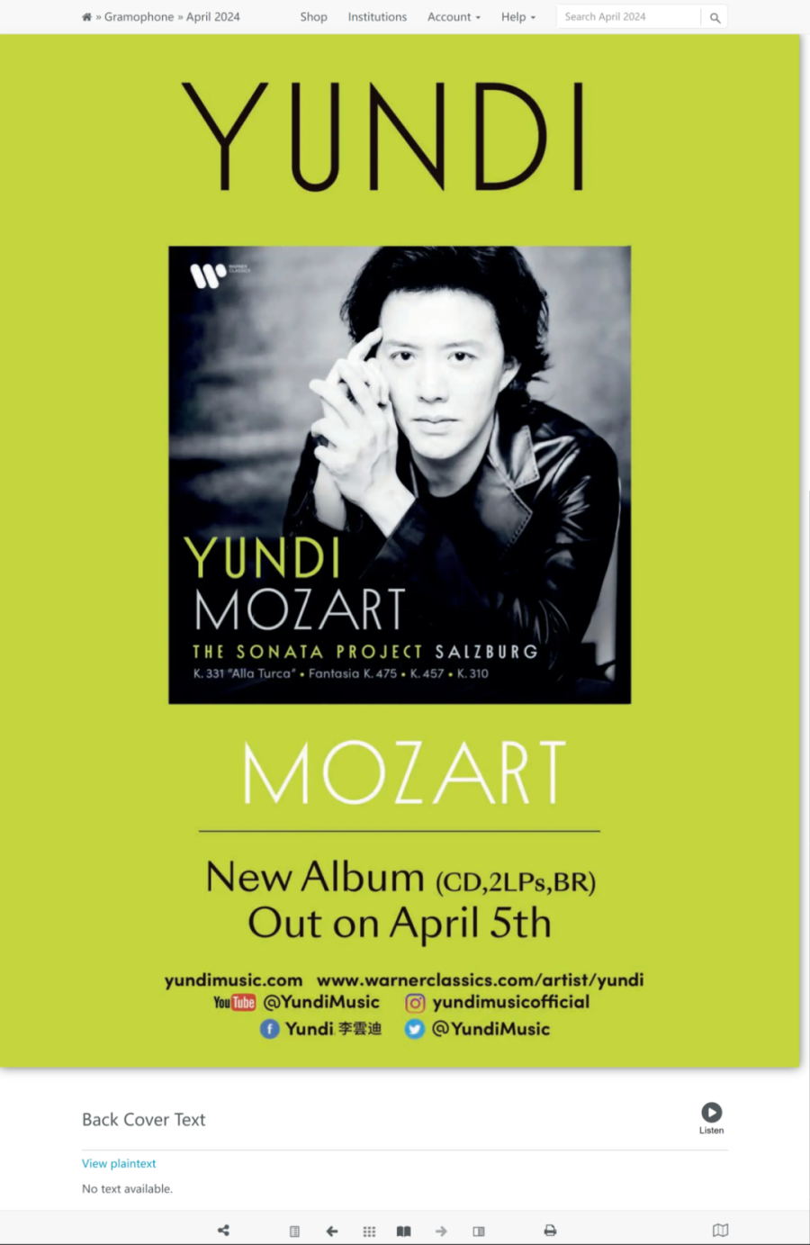 李云迪新专辑发布,德国古典音乐杂志盛赞“他将莫扎特音乐推向巅峰”