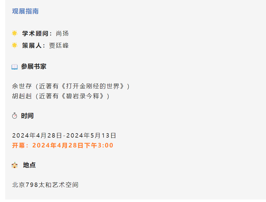 余世存和胡赳赳近期分别出版了新书《打开金刚经的世界》和《碧岩录今释》,这两本书是他们对禅宗经典《金刚经》和《碧岩录》的个体化体悟和阐释,这次展览可以看作他们思考和体悟中华禅宗精神的心得呈现。
