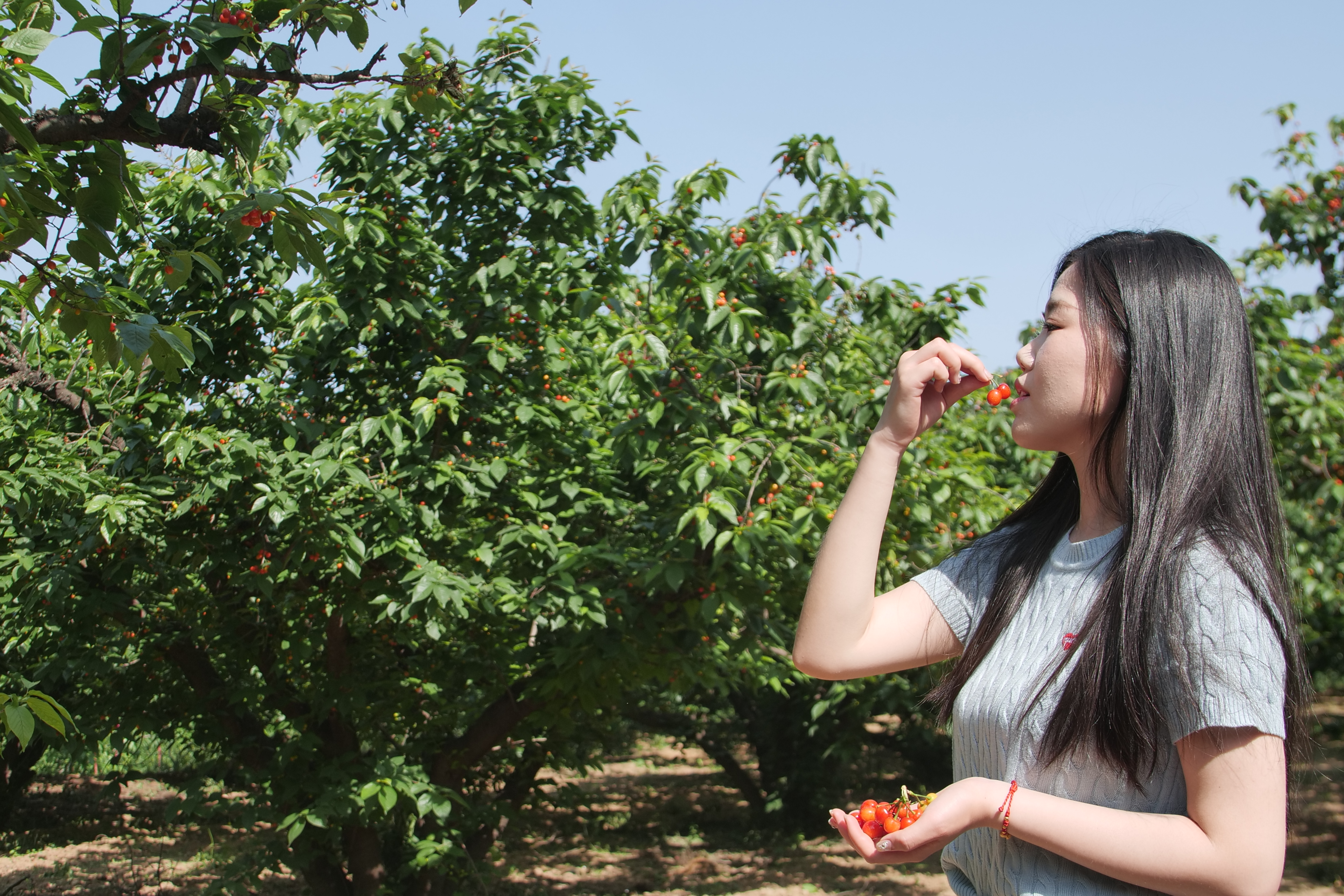 走进园内,清新的果香扑面而来,一株株樱桃树绿意葱茏、长势喜人,一颗颗饱满的红樱桃点缀其间,阳光照射下更显诱人,让人忍不住立刻采摘品尝。