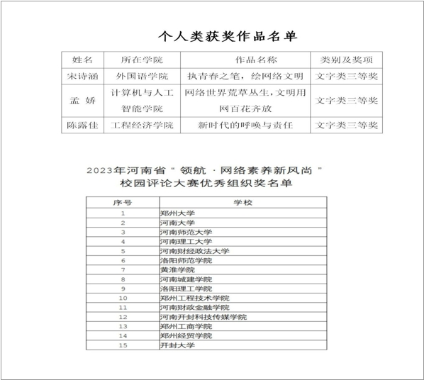 河南财政金融学院在2023年河南省“领航•网络素养新风尚”校园评论大赛中荣获佳绩