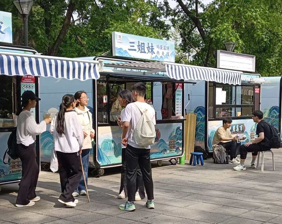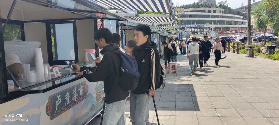 “学校放假了,昨天晚上和朋友们一起相约夜爬嵩山,今天上午从卢崖瀑布景区下山,到达出口,就看到一排卢崖集市,这里有嵩山栀茶、卢崖手工凉皮、三姐妹鸡蛋灌饼、肉夹馍、石道牛肉熟食、水果、农家洛馍卷菜,玩了一夜下山了又累又饿,看到这里瞬间食欲满满,我们每人一杯柠檬水,一碗凉皮,一个烤肠,一个洛馍卷菜,共享一份牛肉,瞬间满血复活。这个假期,我们登上了嵩山峻极峰,观赏了卢崖瀑布,品尝了地方美食,观赏了美丽夜景,实在是太棒了。”大学生游客王伟涛说。