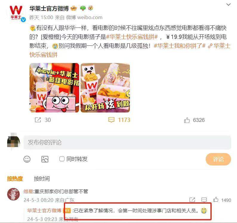 华莱士其实是最早回应相关舆情的品牌,3日上午9时许,华莱士官方微博曾在留言区回复网友质疑表示“已在紧急了解情况”。