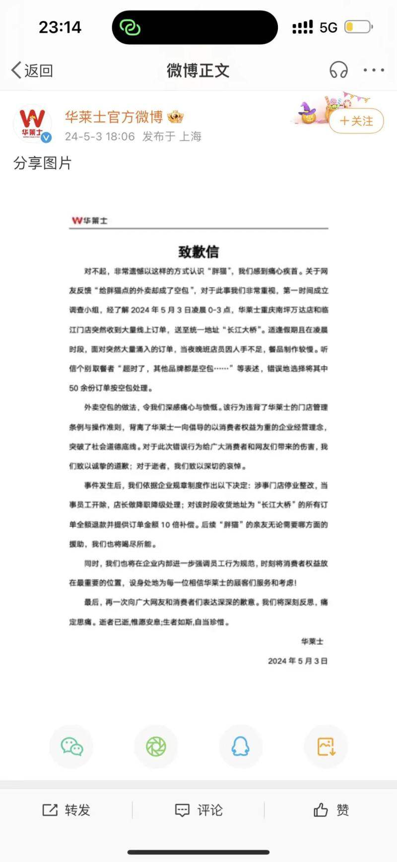 下午6时许,华莱士发布官方致歉信回应此事。事件发生后,品牌依据企业规章制度作出以下决定:涉事门店停业整改,当事员工开除,店长做降职降级处理;对该时段收货地址为“长江大桥”的所有订单全额退款并提供订单金额10倍补偿。