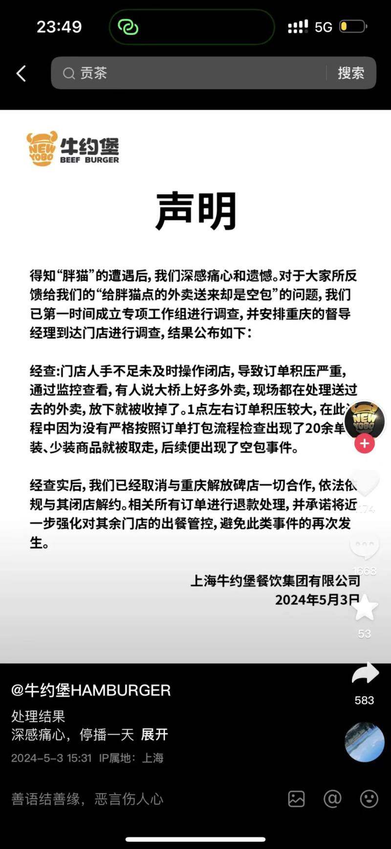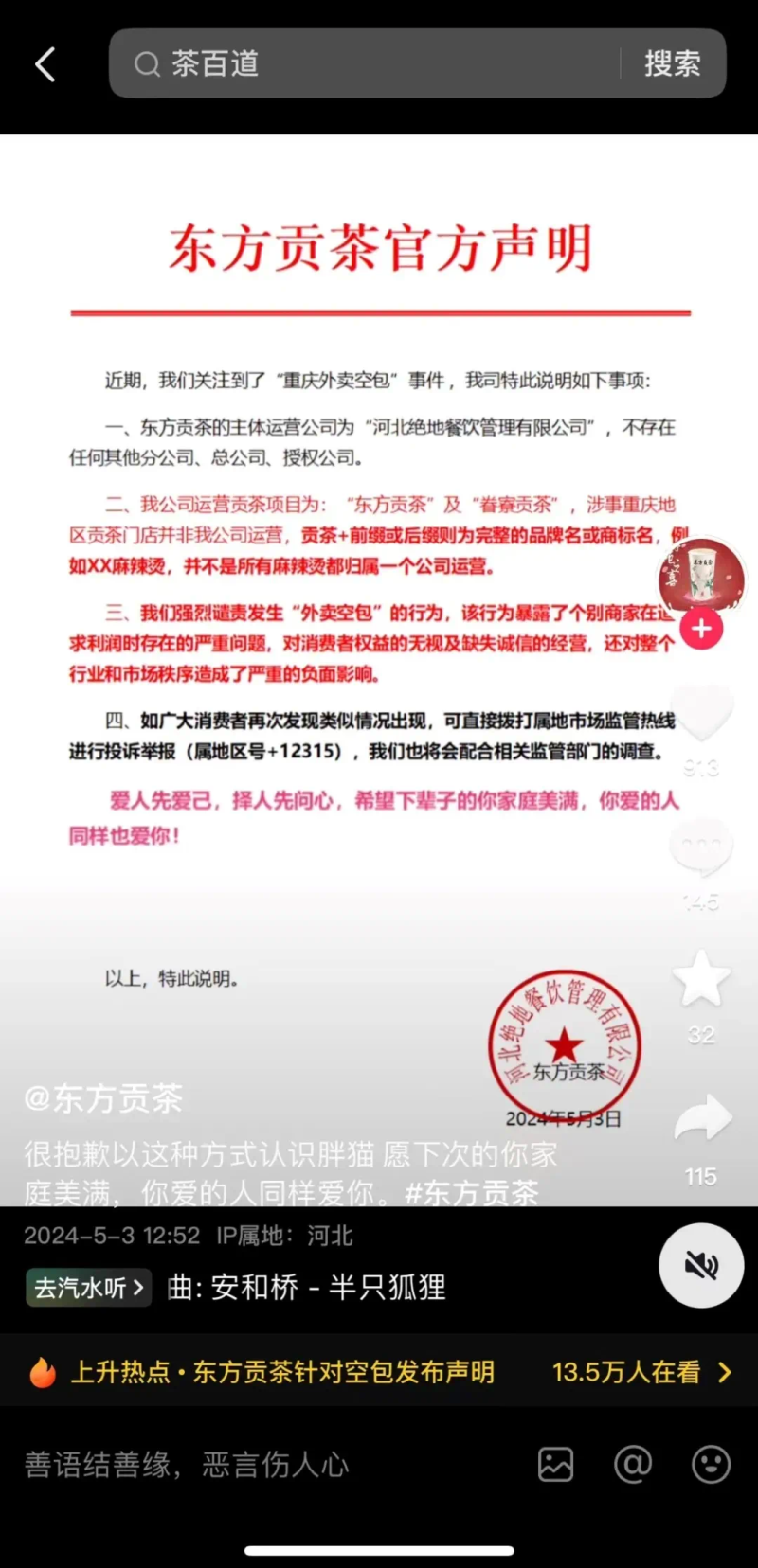 昨日中午时分,东方贡茶已经通过官方抖音发布官方声明,是最早正式回应空包事件的品牌。东方贡茶指出,涉事重庆地区贡茶门店并非公司运营。同时其强烈谴责发生“外卖空包”的行为,表示该行为暴露了个别商家在追求利润时存在的严重问题。