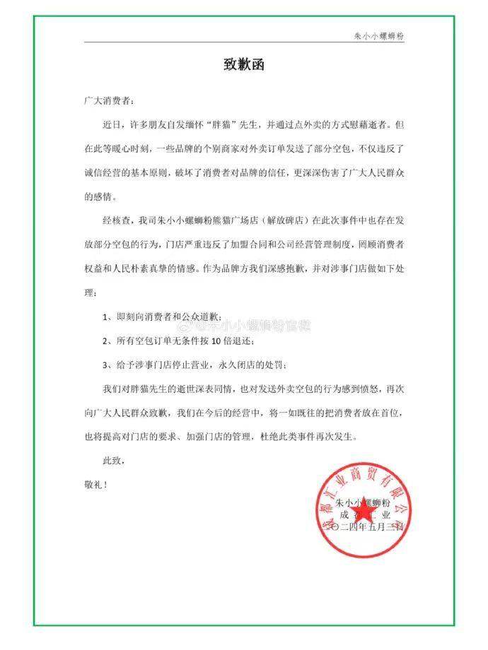 在@朱小小螺蛳粉官微 发布的致歉函中,品牌提到部分空包行为确实存在。对此,品牌给予涉事门店停止营业、永久闭店的处罚,并对所有空包订单无条件按10倍退还。