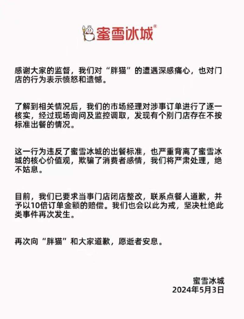 目前已要求门店开除涉事员工,并按照公司门店管理制度扣除门店保证金,依法依规与其闭店解约。所涉及订单,已要求涉事门店全部退款、逐一致歉,并按照相关法律法规要求,给予每笔订单金额10倍的现金补偿。同时,决定以“胖猫”之名,向四川省青少年发展基金会“茶百道爱心基金”追加捐款100万元。