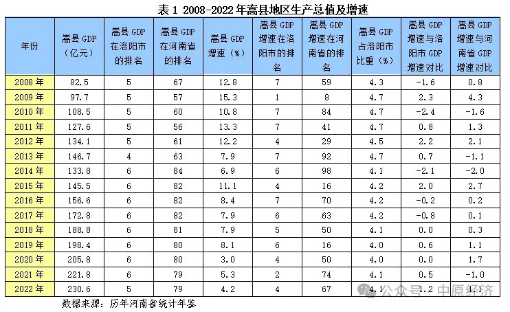 从GDP总量来看,嵩县GDP持续增加,2022年为230.6亿元,在洛阳市下辖7个县(市)中排名第6位,在全省的排名由2008年的第69位下降到2022年为第79位。从GDP占比来看,嵩县GDP占洛阳市比重维持在4%左右,2022年为4.1%。从GDP增速来看, 2022年嵩县GDP增速为4.2%,在洛阳市下辖7个县(市)中排名第4位,河南省排名第67位(见表 1)。